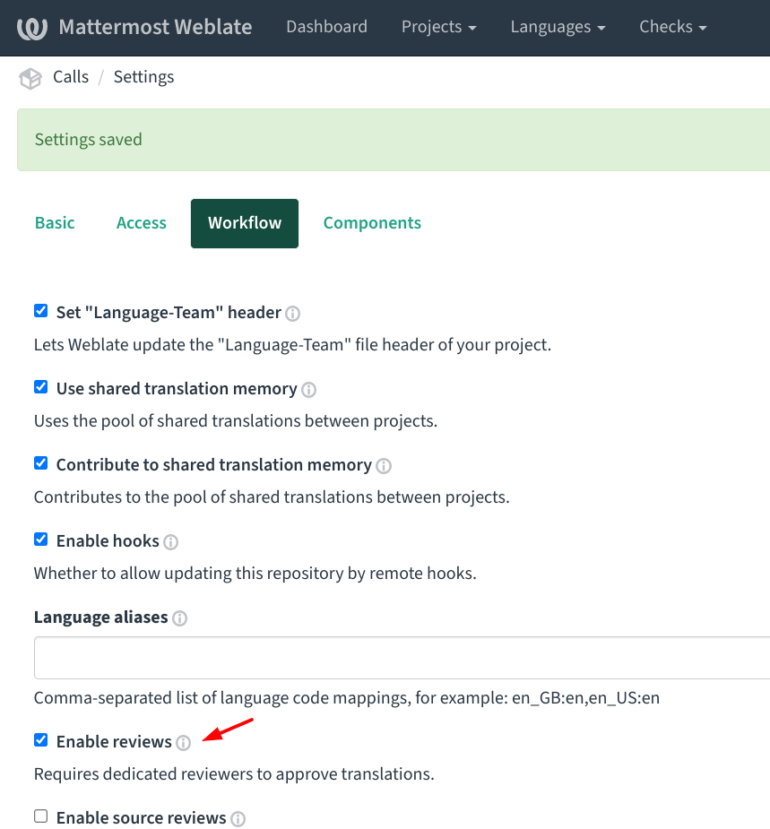 Note: Make sure to enable reviews for the project. In Weblate, go to Project Settings, select the Workflow tab, and select Enable Reviews: